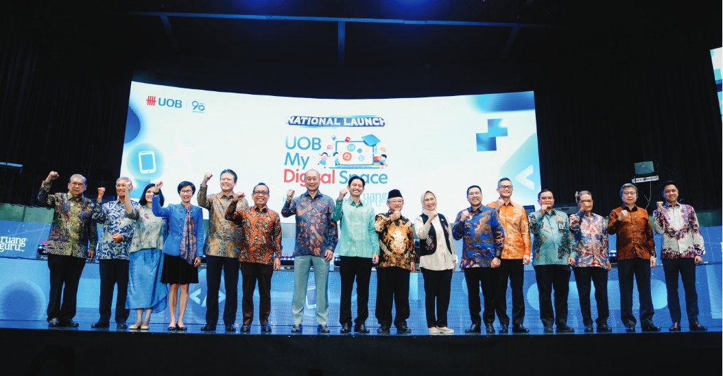 Mr Wee Ee Cheong, Deputy Chairman and CEO, UOB (7th from left) and Mr Hendra Gunawan, CEO of UOB Indonesia (5th from left) with senior government representatives, including His Excellency Prof. Dr. Pratikno, Coordinating Minister for Human Development and Cultural Affairs of the Republic of Indonesia, and His Excellency Prof. Dr. Abdul Mu’ti, Minister of Primary and Secondary Education of the Republic of Indonesia at the official launch of UOB My Digital Space in collaboration with Ruangguru at Balai Sarbini, Jakarta.